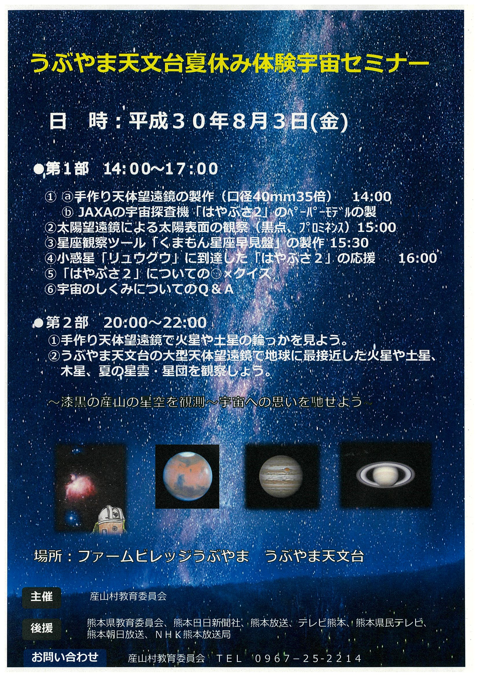 8月3日(金)にうぶやま天文台(ファームビレッジ産山内)で宇宙セミナーが開催されます。