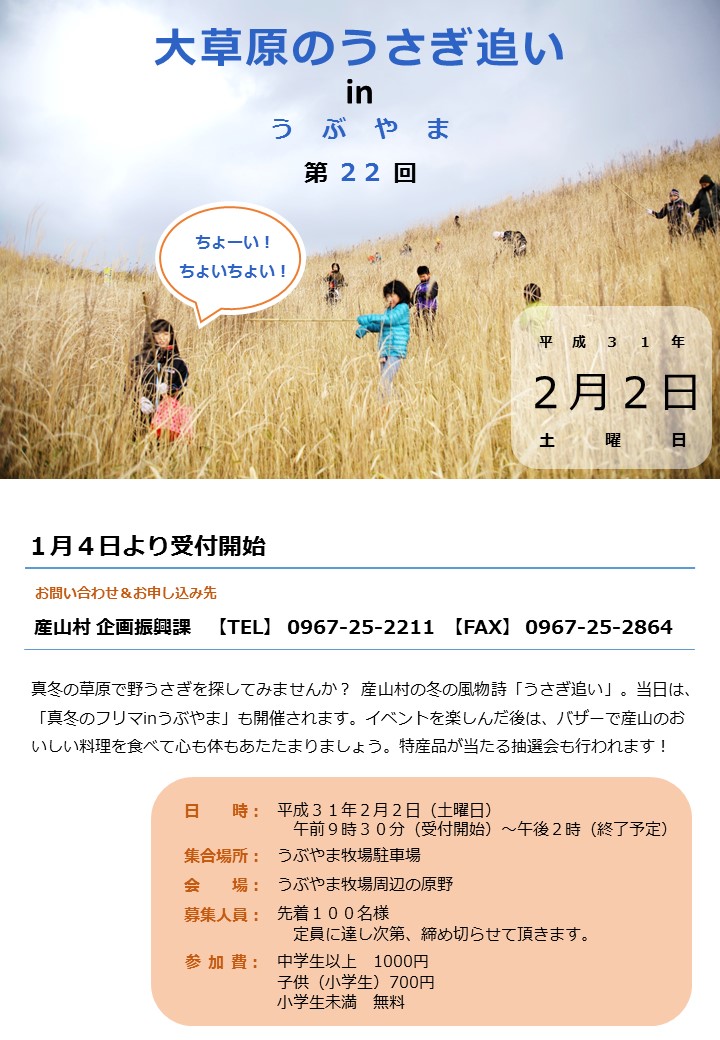 今年も産山村の冬の風物詩「うさぎ追い」を2月2日(土)に開催します。うぶやま牧場周辺の草原の中で、「チョーイチョーイ」と声を掛け合いながら、野うさぎを探す行事は今年で22回目。捕まえたうさぎはイベント終了時にキャッチ&リリースで草原に放ちます。
