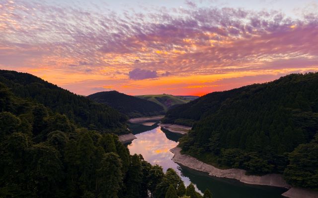 大蘇ダムは、大分県竹田市および熊本県阿蘇郡産山村・阿蘇市にまたがる約2,500haの農用地の新規水源として、大野川水系大蘇川に建設しました。水をせき止めるダム本体の堤の高さが約70m、長さ約262mで、総貯水量は430万m3となります。